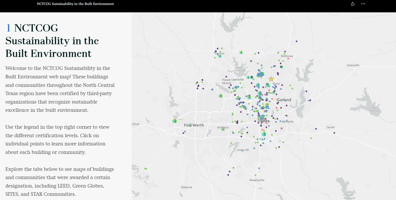This interactive map highlights buildings and communities throughout the North Central Texas region that have been certified by third-party organizations that recognize sustainable excellence in the built environment.